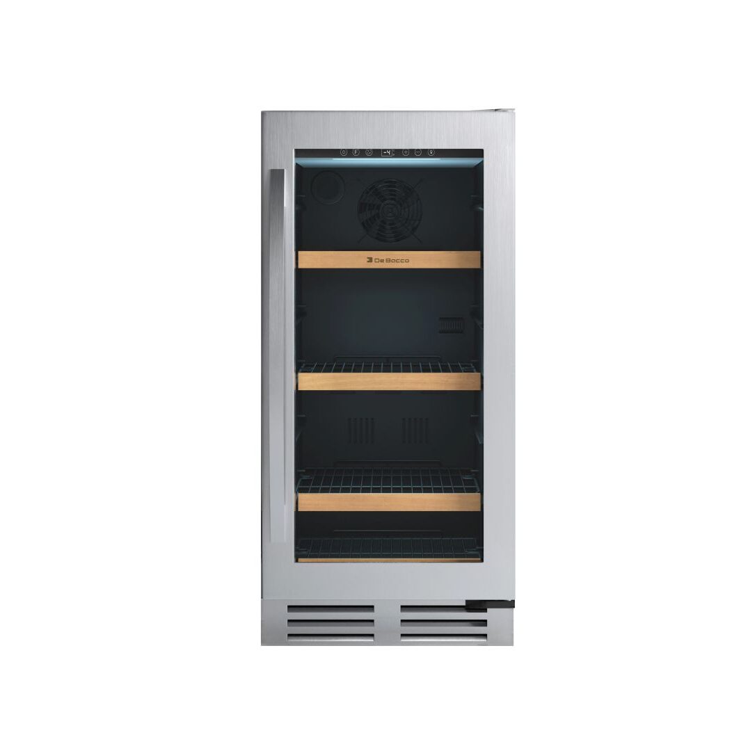 O sistema de refrigeração por compressor silencioso garante estabilidade térmica e desempenho eficiente. O design premium se destaca pela porta de vidro duplo Low-E, com acabamento seamless (sem emendas no aço) e tecnologia de redução de sudação, que elimina a condensação no vidro externo. As prateleiras com frente em madeira reforçam a harmonia estética com a Adega De Bacco.