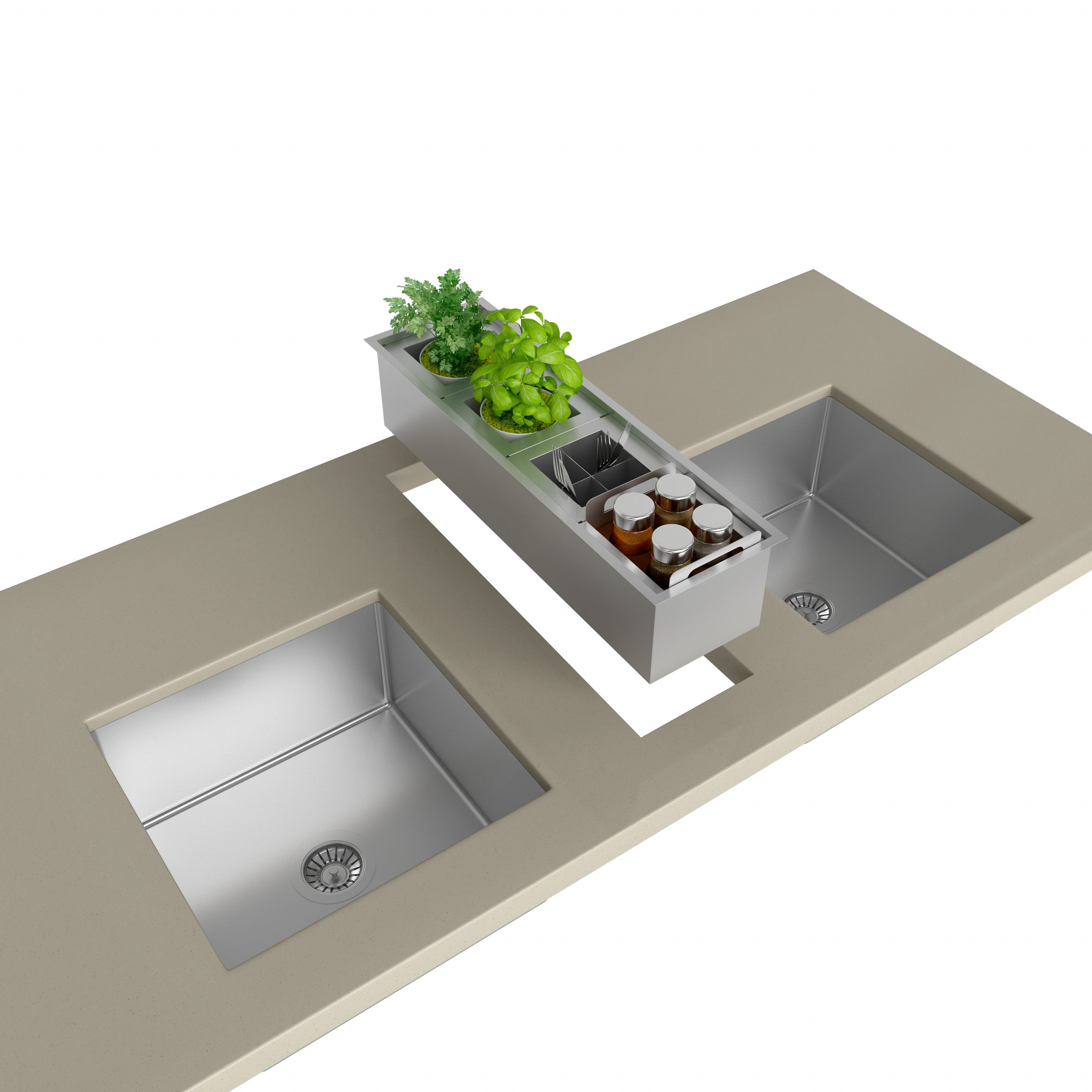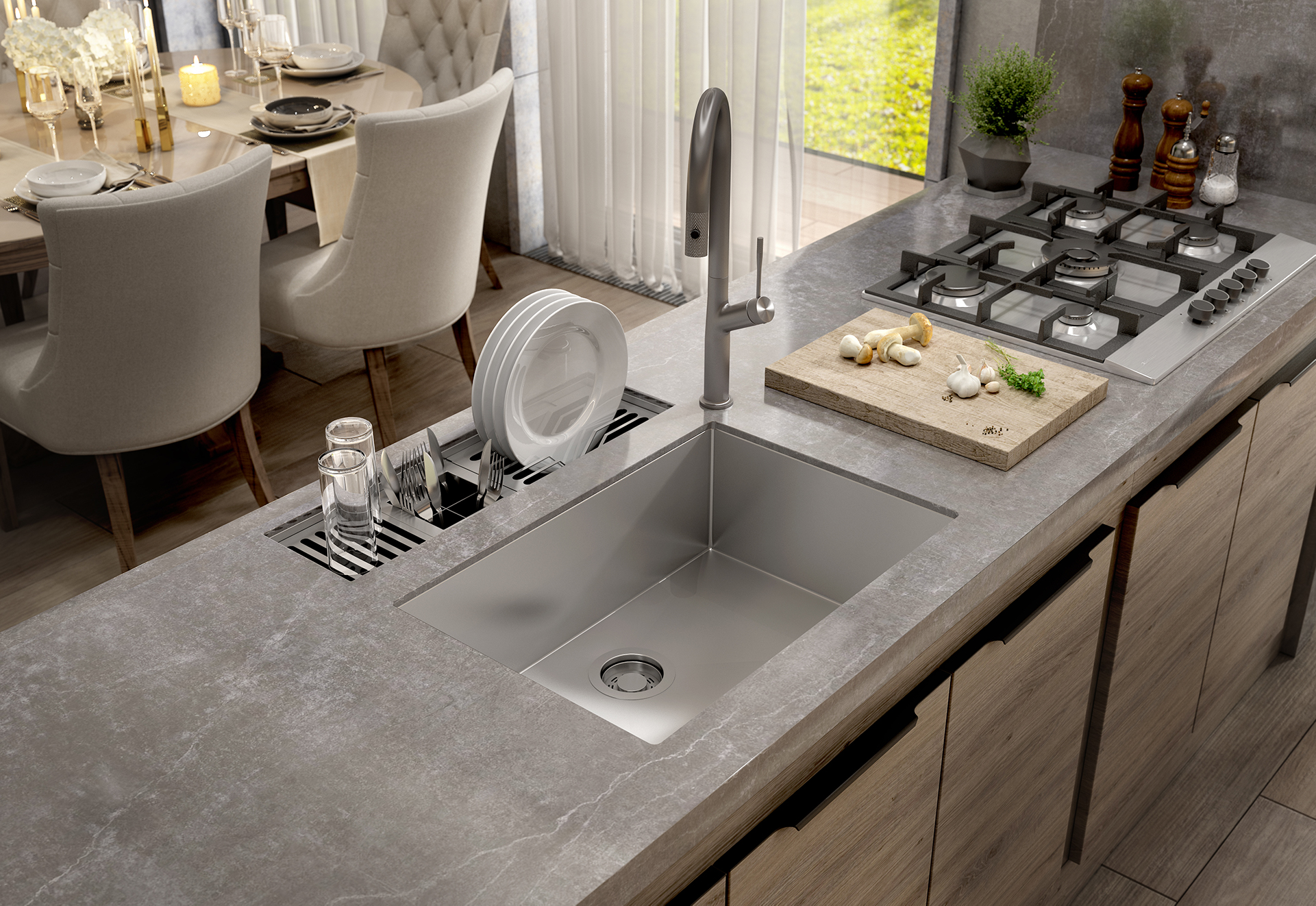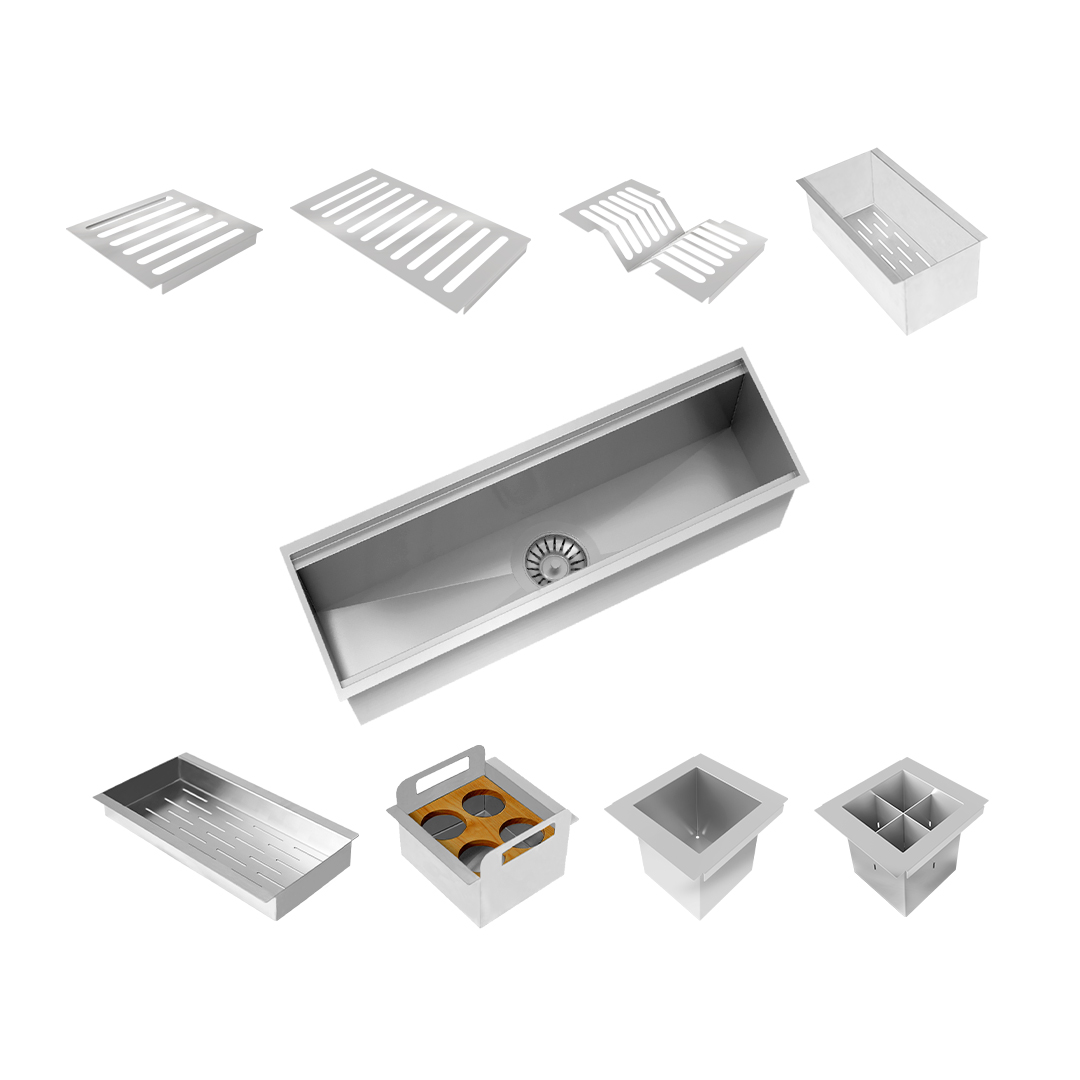 Pode ser instalado de forma linear à cuba ou em um nível acima, adaptando-se a diferentes layouts e sendo compatível com bancadas em granito, corian, silestone e superfícies similares. Os acessórios móveis garantem flexibilidade e ergonomia no uso diário.