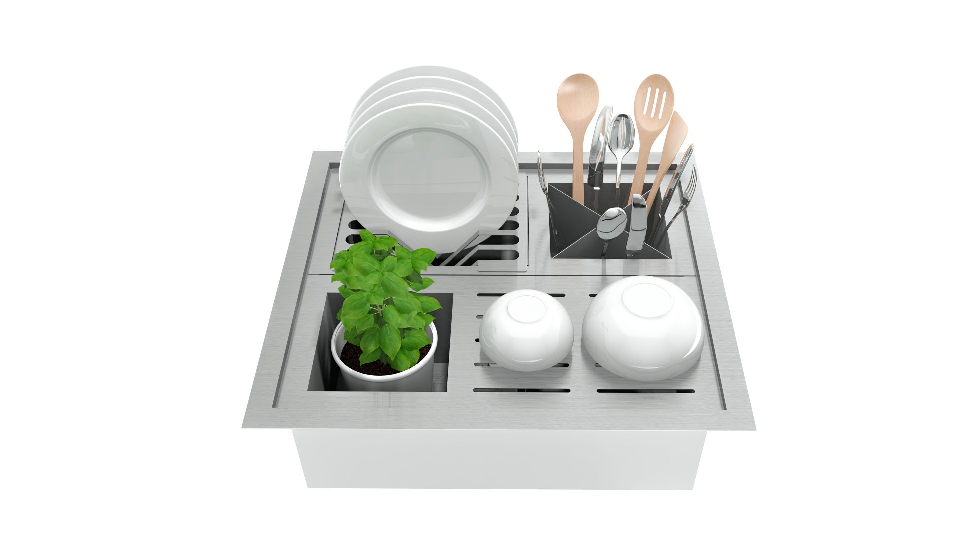 Com os acessórios, auxilia na organização da bancada, permitindo acomodar talheres, pratos, copos e até uma mini-horta, tornando o uso diário mais prático e eficiente.