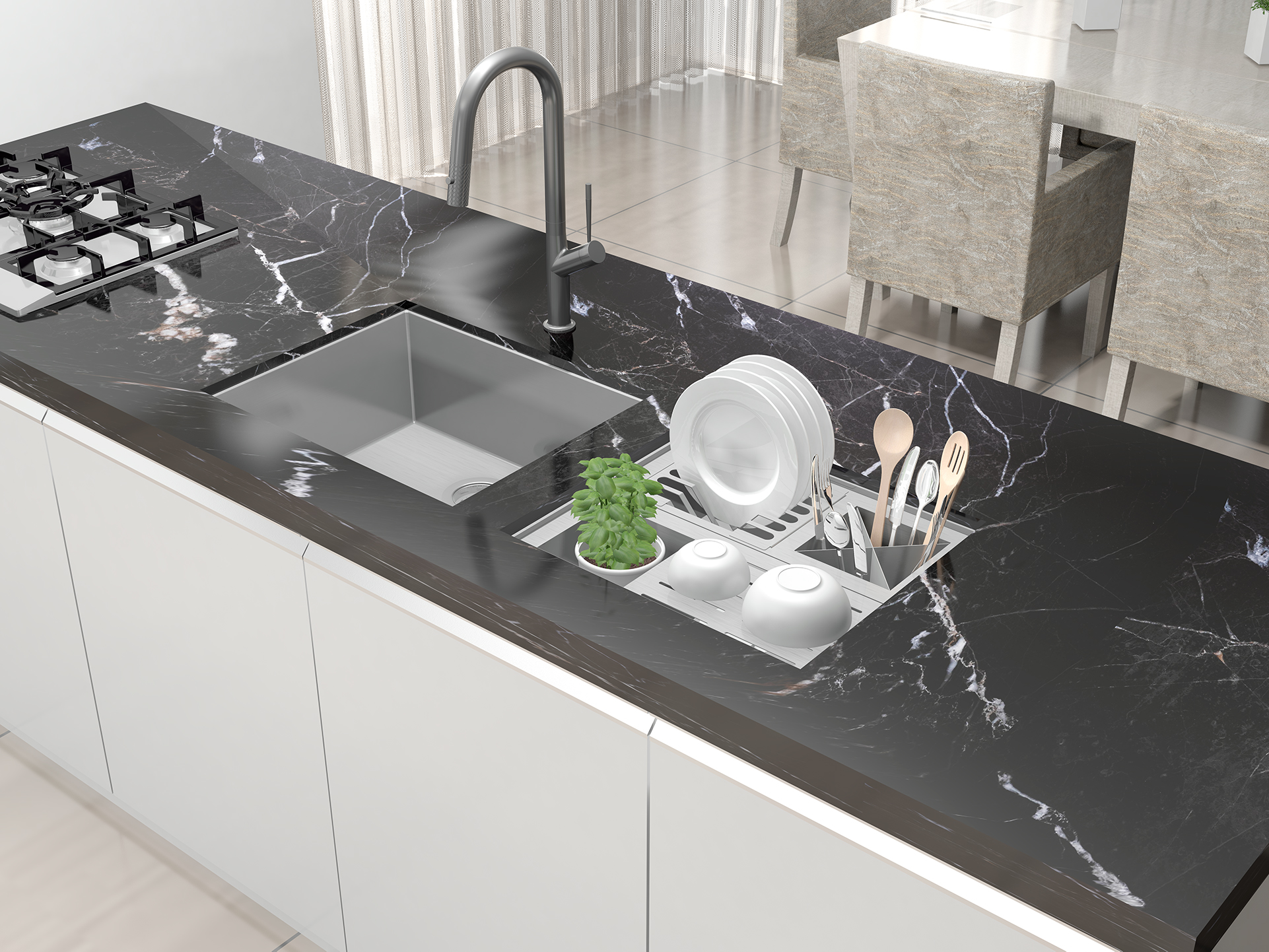 O modelo possui instalação undermount, criando um visual limpo e sofisticado, e é compatível com bancadas em granito, corian, silestone e superfícies similares, adaptando-se a diferentes layouts e propostas arquitetônicas.