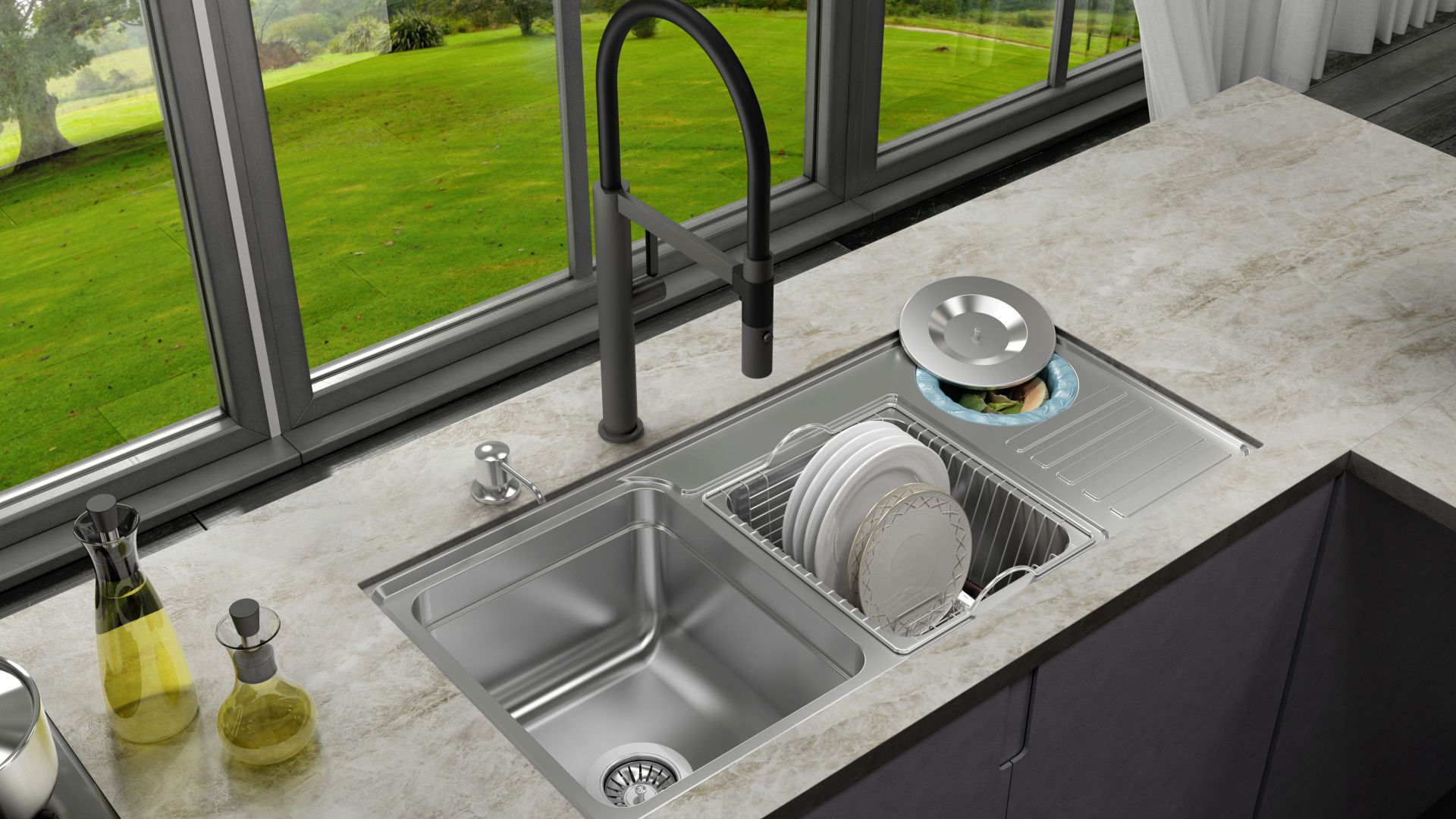 Com duas cubas e uma lixeira acoplada, o modelo permite executar diferentes tarefas simultaneamente, tornando a rotina na cozinha mais eficiente e fluida.