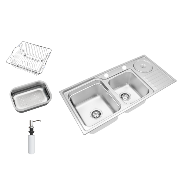 Modelo com duas cubas + cuba auxiliar com lixeira acoplada, oferecendo máxima praticidade;