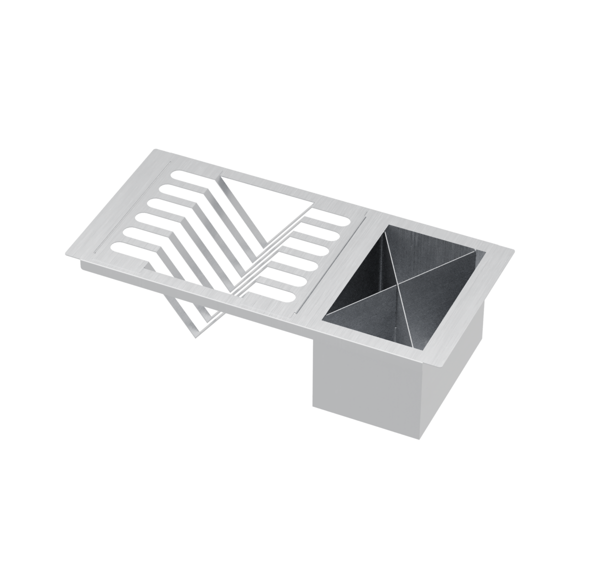 Com estrutura perfurada e base elevada, proporciona escoamento rápido da água, evitando acúmulos e facilitando a secagem. Seu encaixe preciso acompanha o design das cubas Quadratino, integrando-se perfeitamente à bancada e unindo funcionalidade e elegância.
