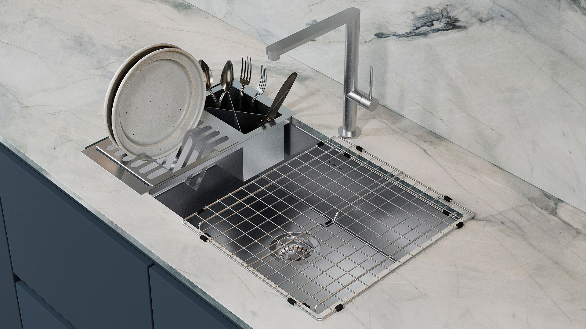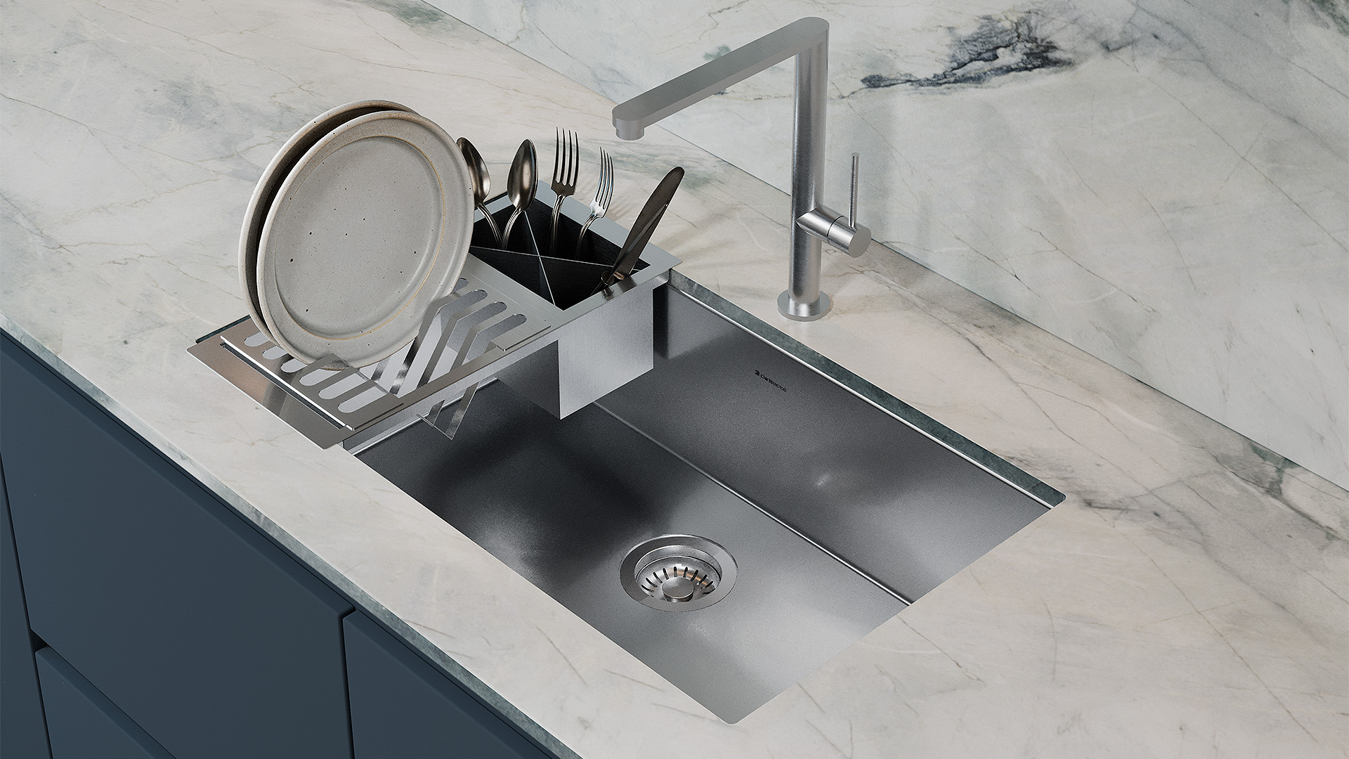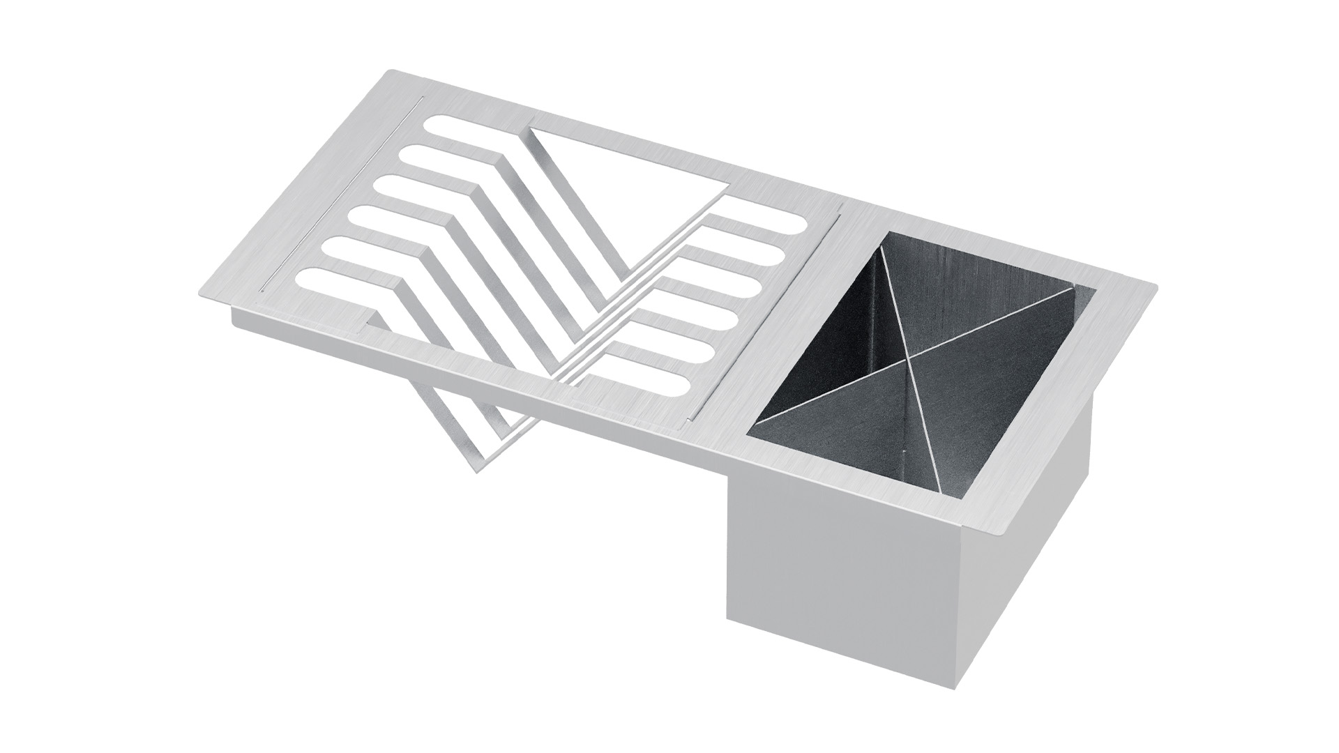 Com estrutura perfurada e base elevada, proporciona escoamento rápido da água, evitando acúmulos e facilitando a secagem. Seu encaixe preciso acompanha o design das cubas Quadratino, integrando-se perfeitamente à bancada e unindo funcionalidade e elegância.