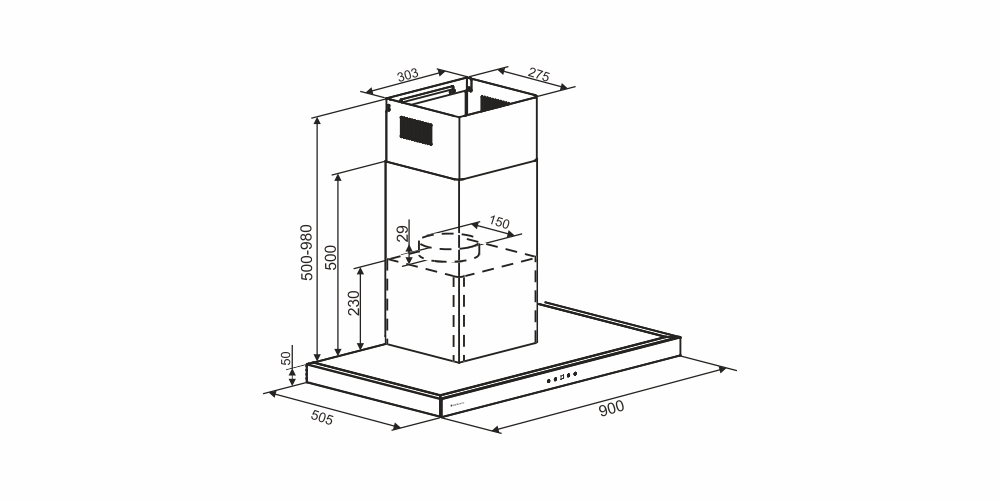 Conta com aspiração central, três velocidades de sucção e vazão de até 1.000 m³/h, podendo operar nos modos depuração ou exaustão, garantindo renovação eficiente do ar. O painel touch com display em LED branco oferece controle preciso, enquanto a função timer permite o desligamento automático após até 9 minutos.
