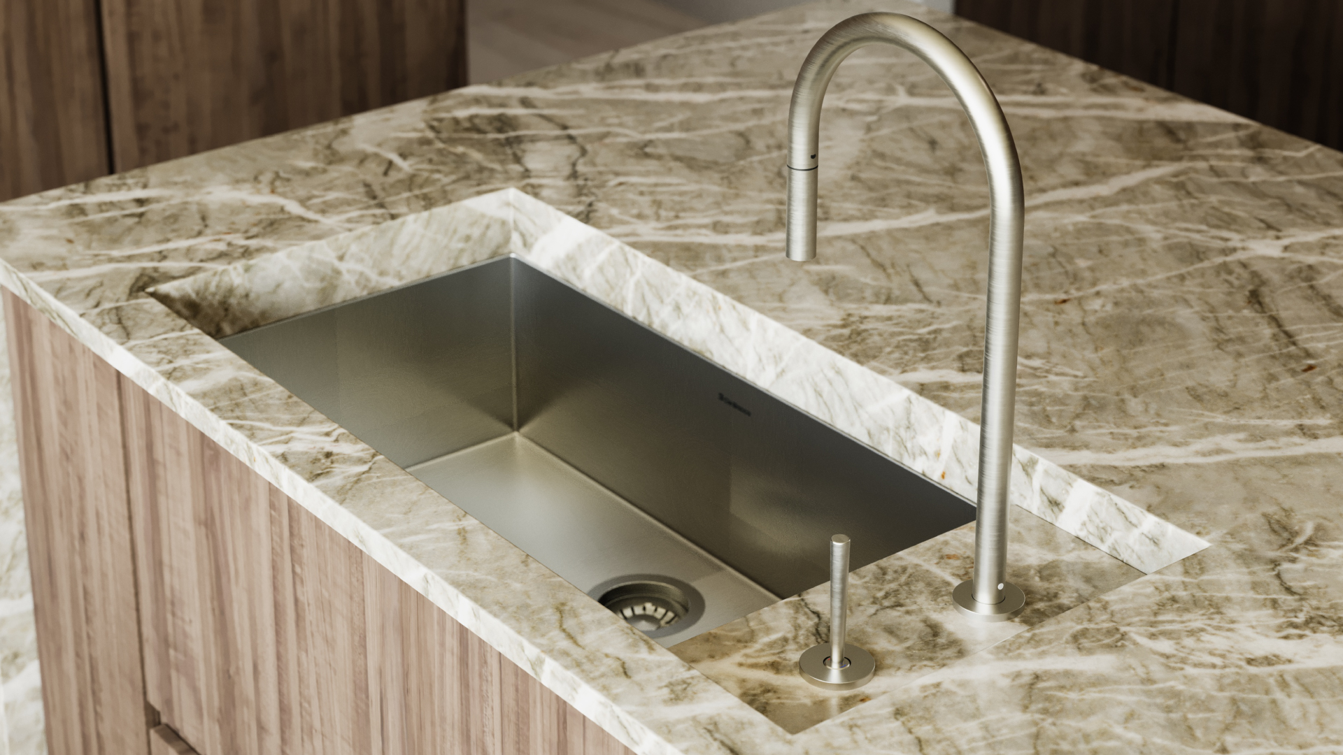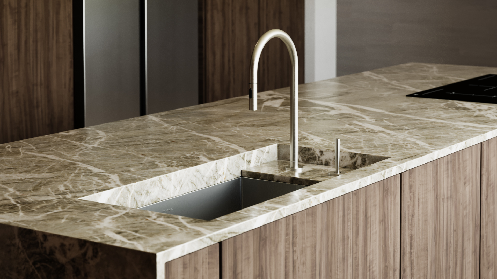O Misturador Monocomando Essenziale De Bacco foi desenvolvido para elevar o projeto da cozinha a um novo patamar de elegância, funcionalidade e precisão.
