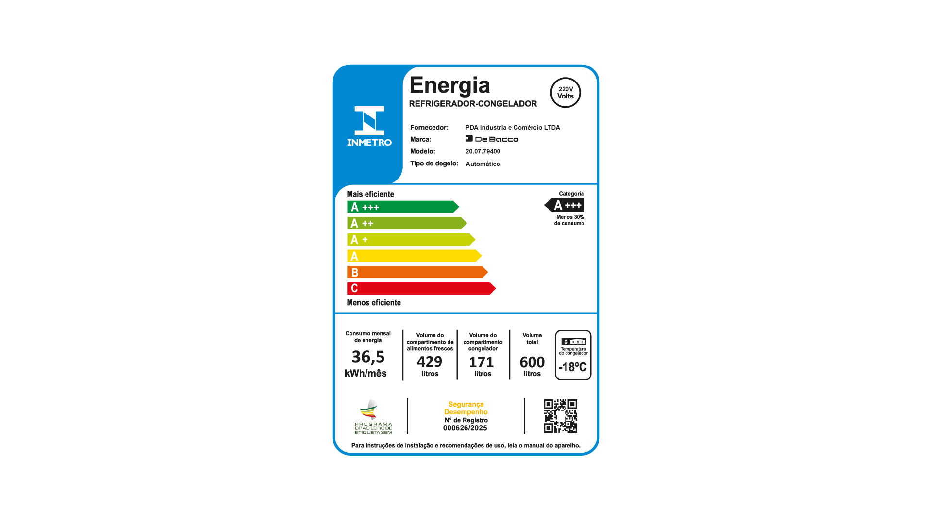 Com 600 litros de capacidade total, sendo 429 L no refrigerador e 171 L no congelador, oferece organização inteligente e fácil acesso por meio da configuração four door, ideal para otimizar a rotina e o armazenamento dos alimentos.